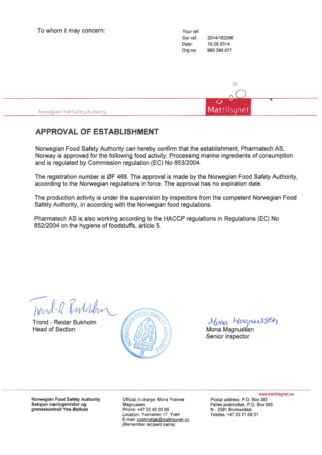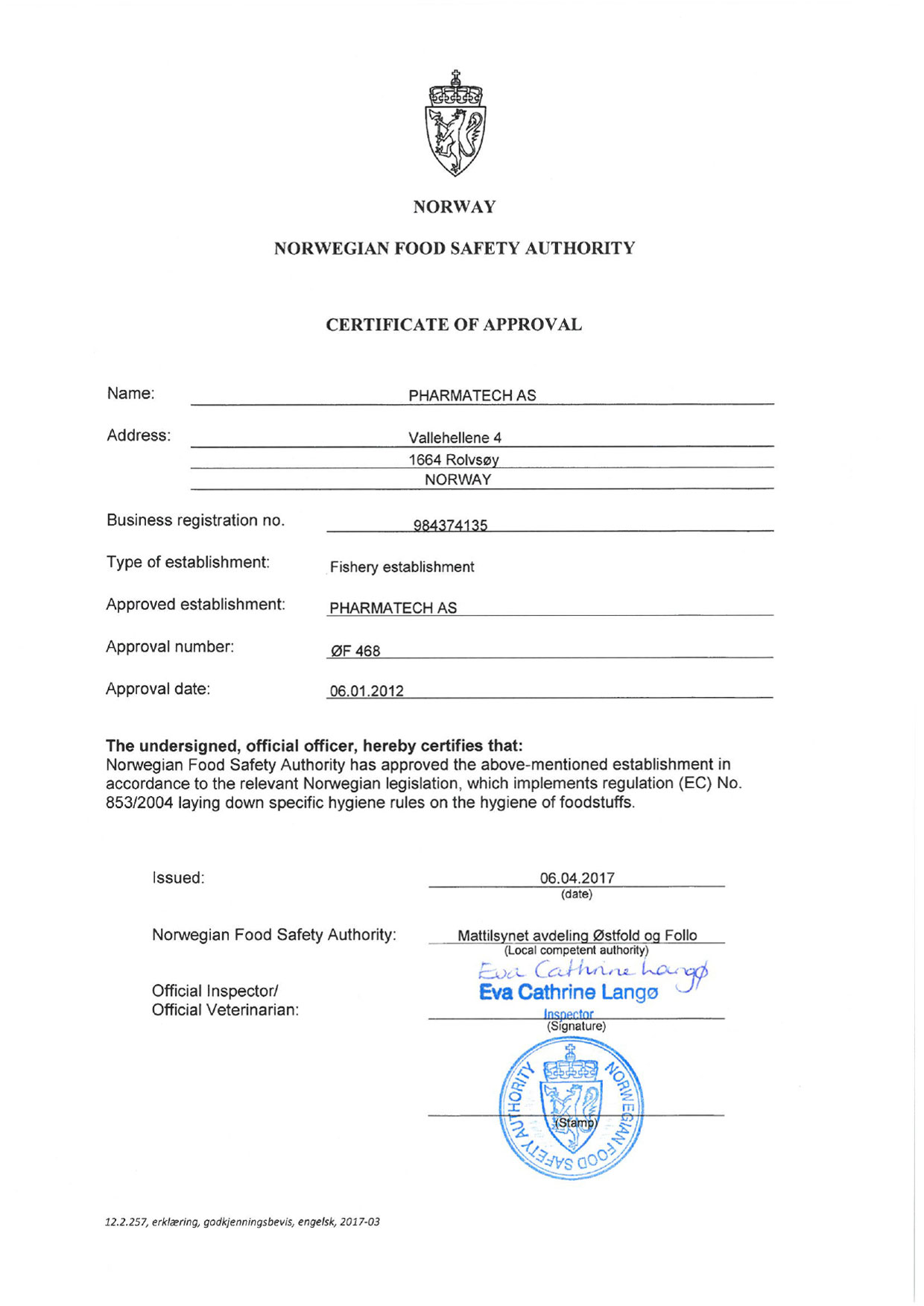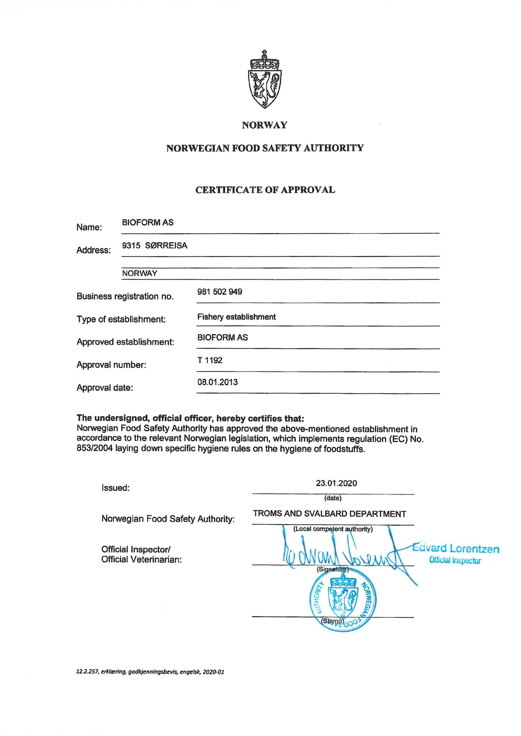 Norwegian Food Safety Authority - Certificate of Approval