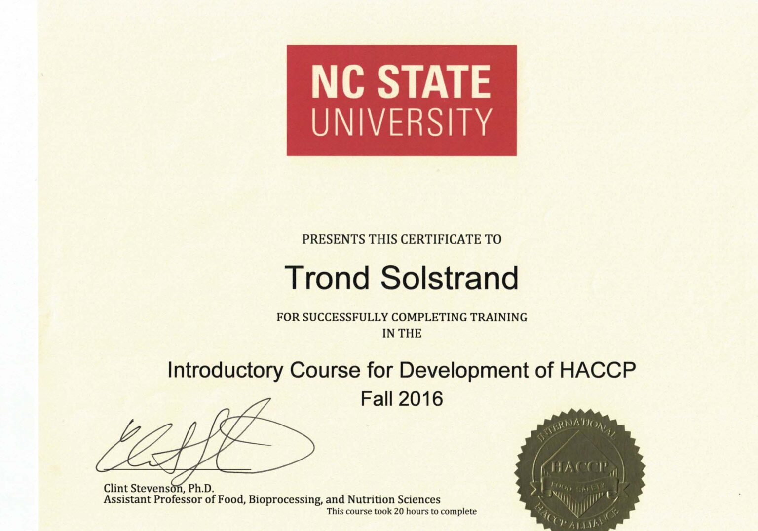 NC State University - HACCP Certificate