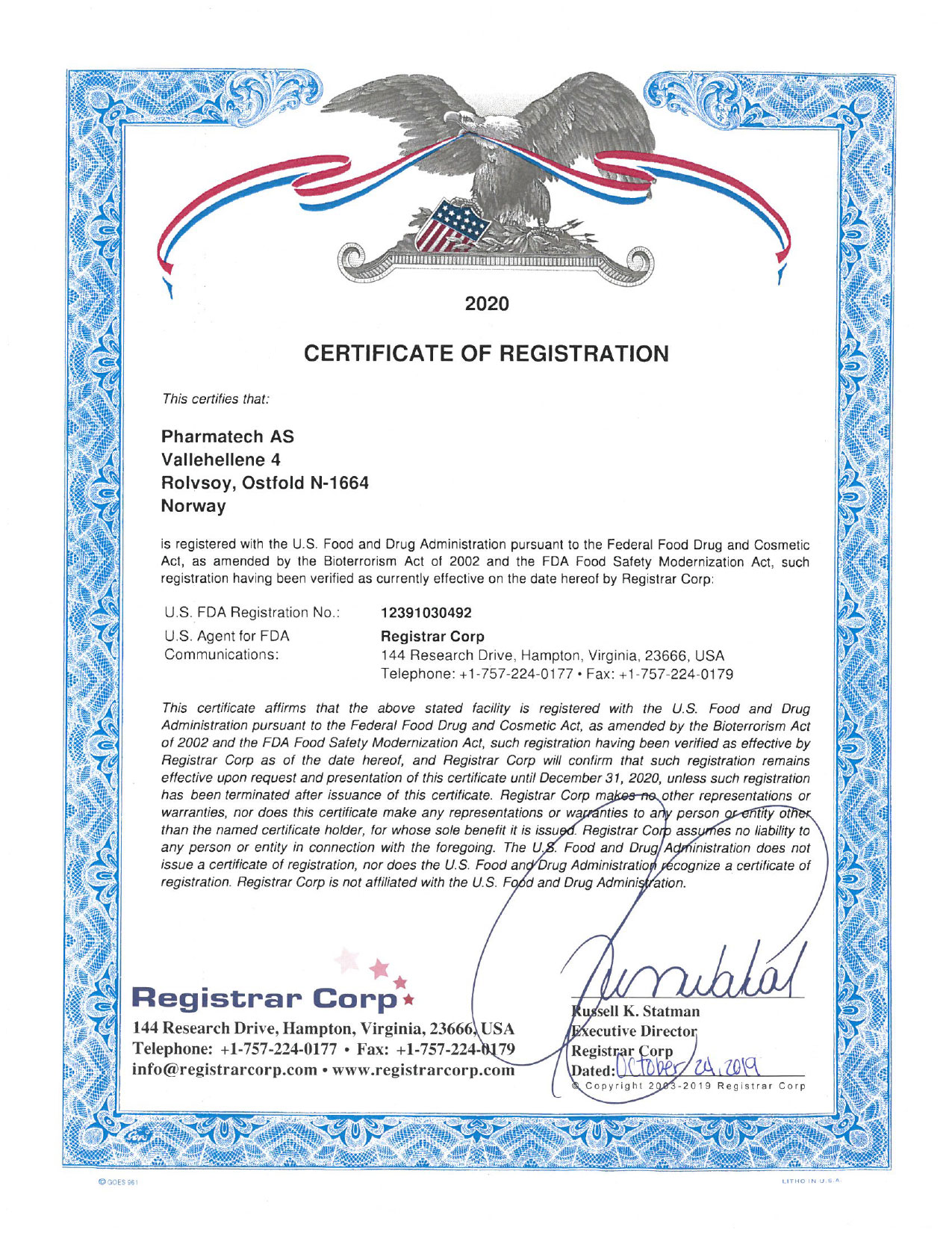 U.S. Food and Drug Administration Certification